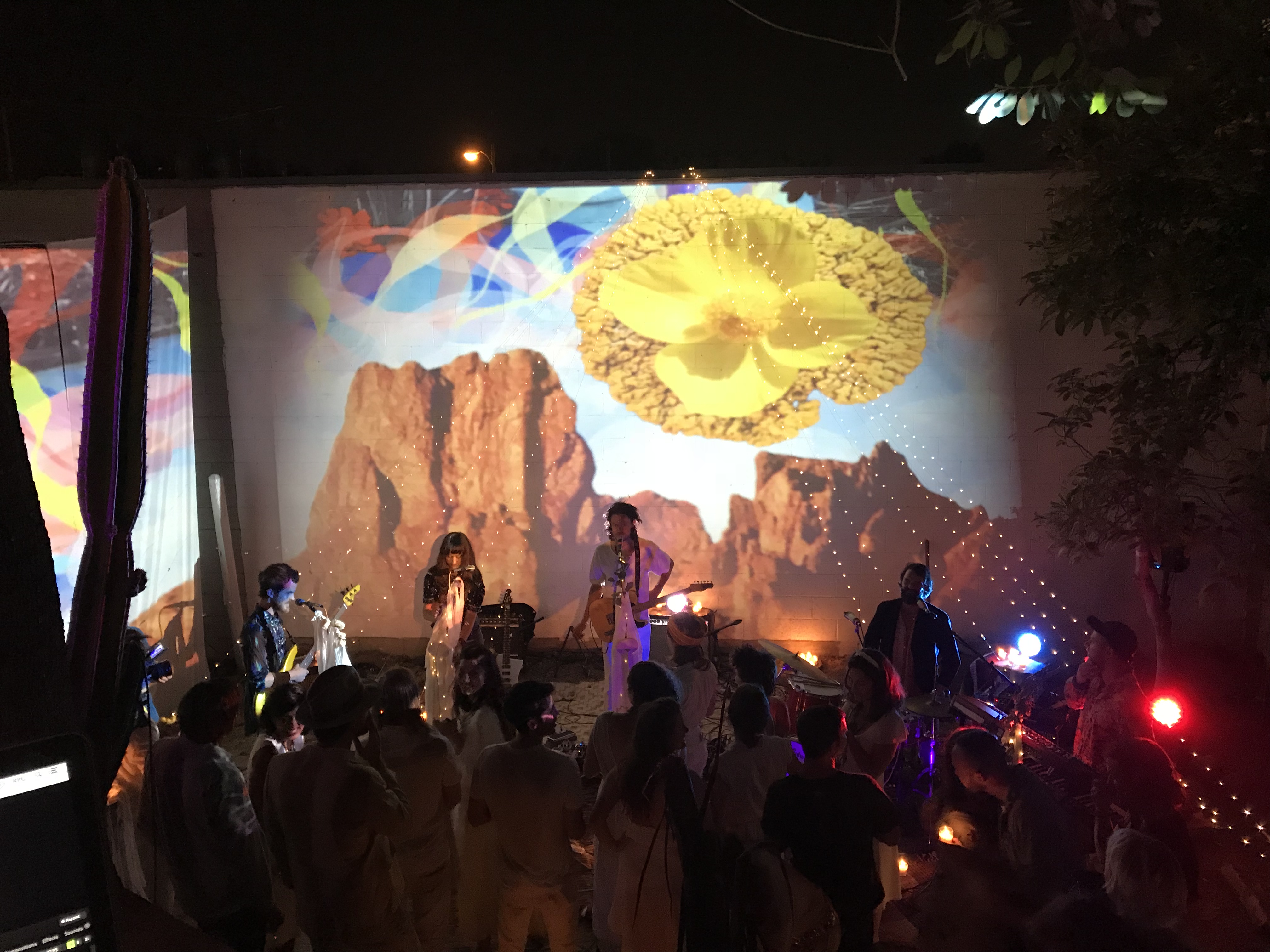 I used Tagtool here for a live music video performance for the band, Amo Amo. I had two projectors mapped to two walls surrounding the band in this backyard garden ampitheather in Echo Park, Los Angeles. I created png assests from photographs I’d taken and used them to create surreal landscapes to fit the vibe of the music.