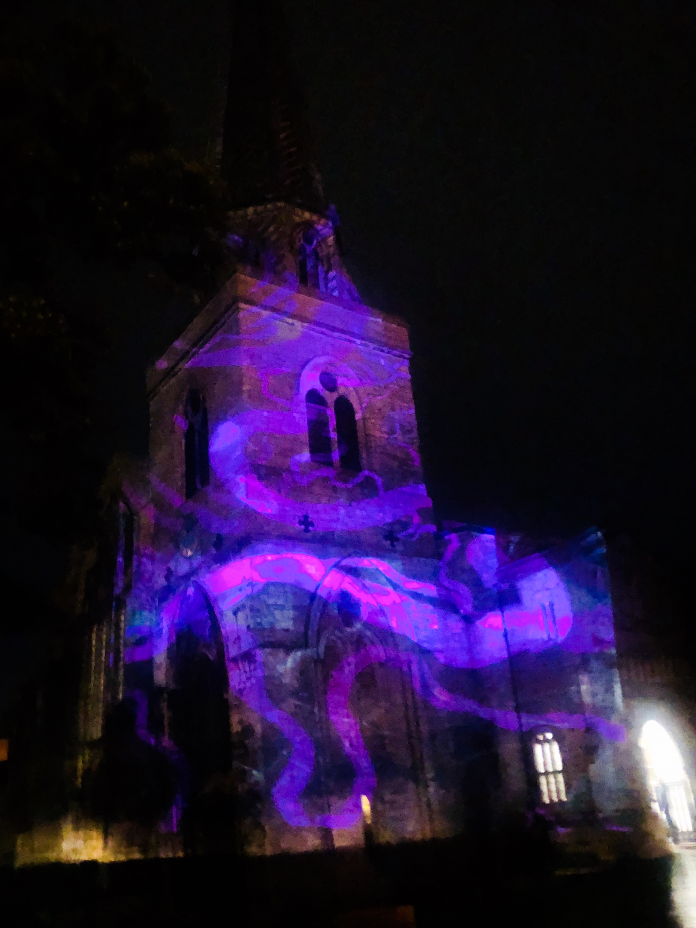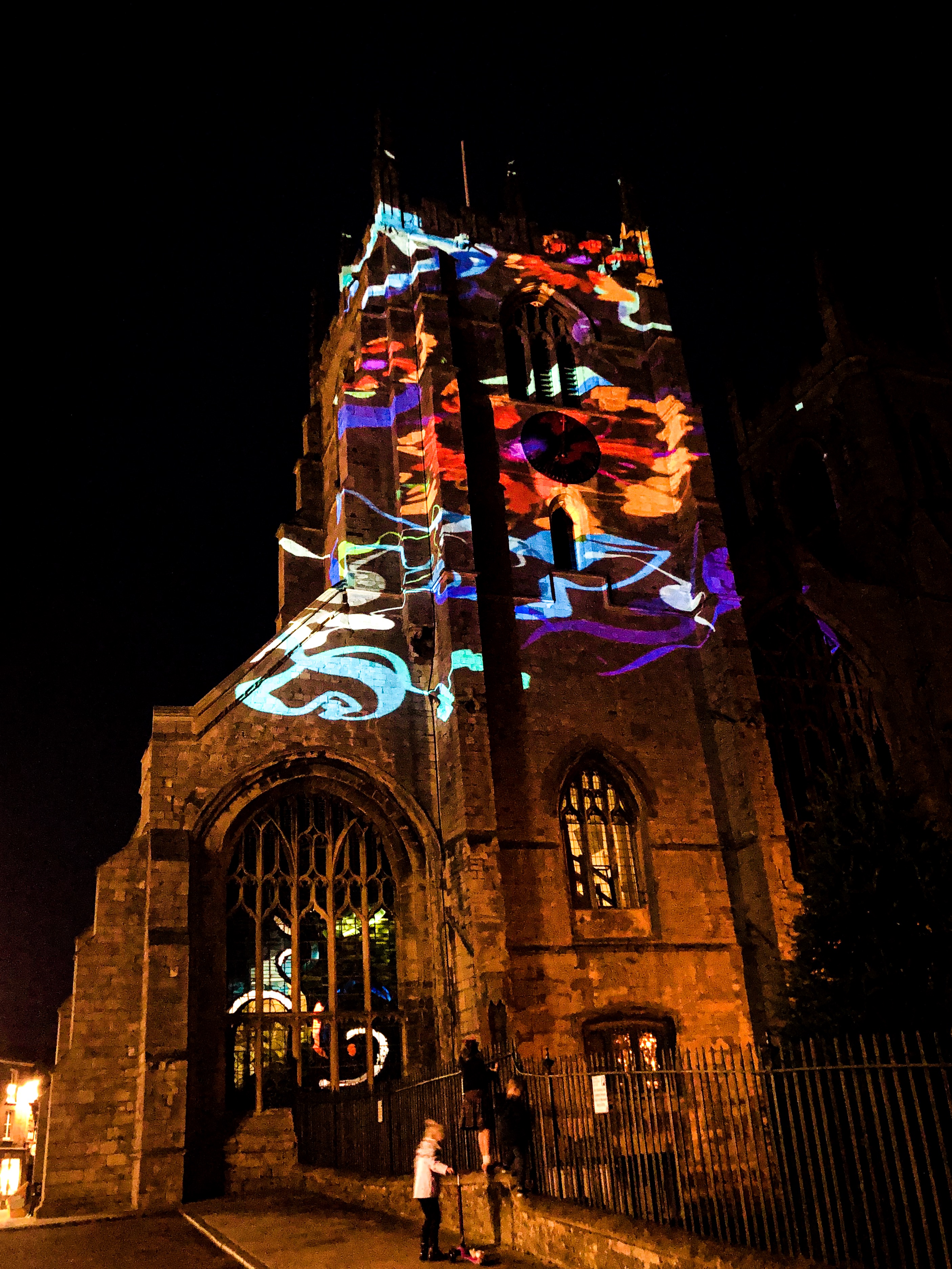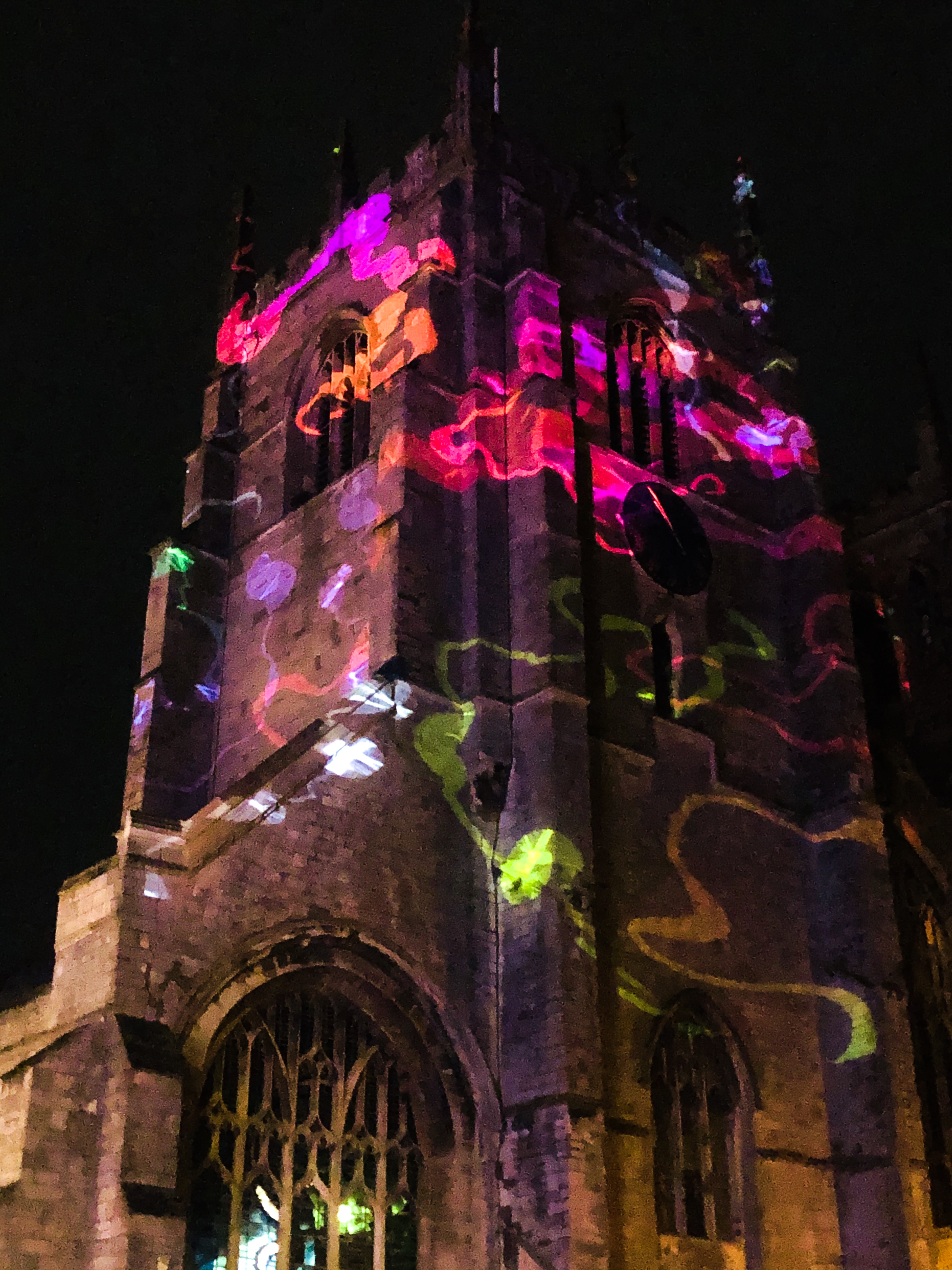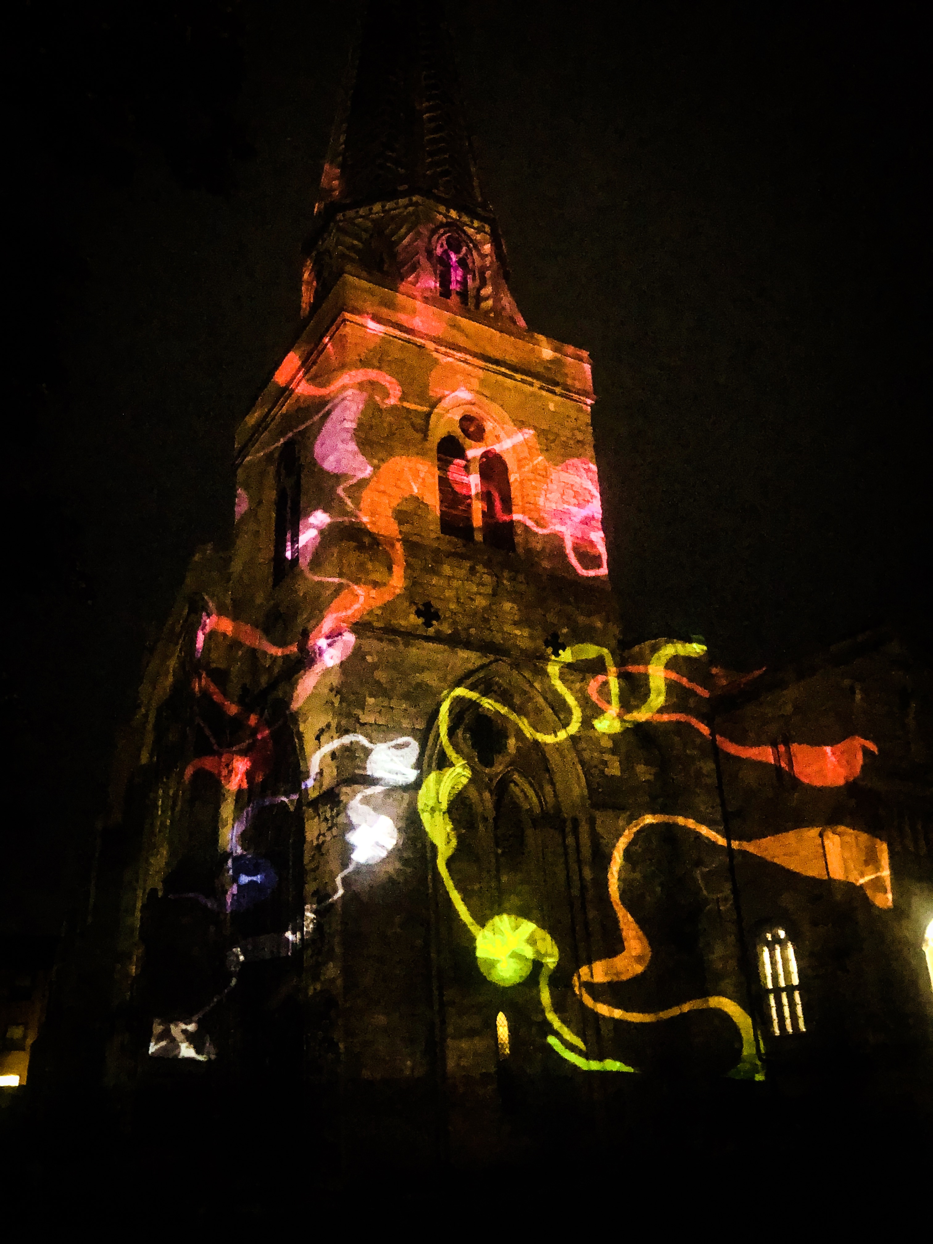 Hi everyone. I just realised I had never shared images from a night festival of light and sound I helped launch in my now-hometown of King’s Lynn. A loop of six designs played simultaneously on two 12th-century churches, St Margaret’s church (aka King’s Lynn Minster, the squared tower) and St Nicholas’s chapel (the pointy spire), which sit half a mile apart. Built 1101 & 1200, respectively, they have a complex history with each other – St N’s was built as the overflow church for St M’s – the latter is the historic heart of the town and was frequented by the rich merchants who lived in this neighbourhood, while St Nick’s belonged more to the maritime community to the north. It was fun to get these buildings in a sort of dialogue with each other as psychedelic autumnal beacons, and to see how the same images and movements played out across their different features.