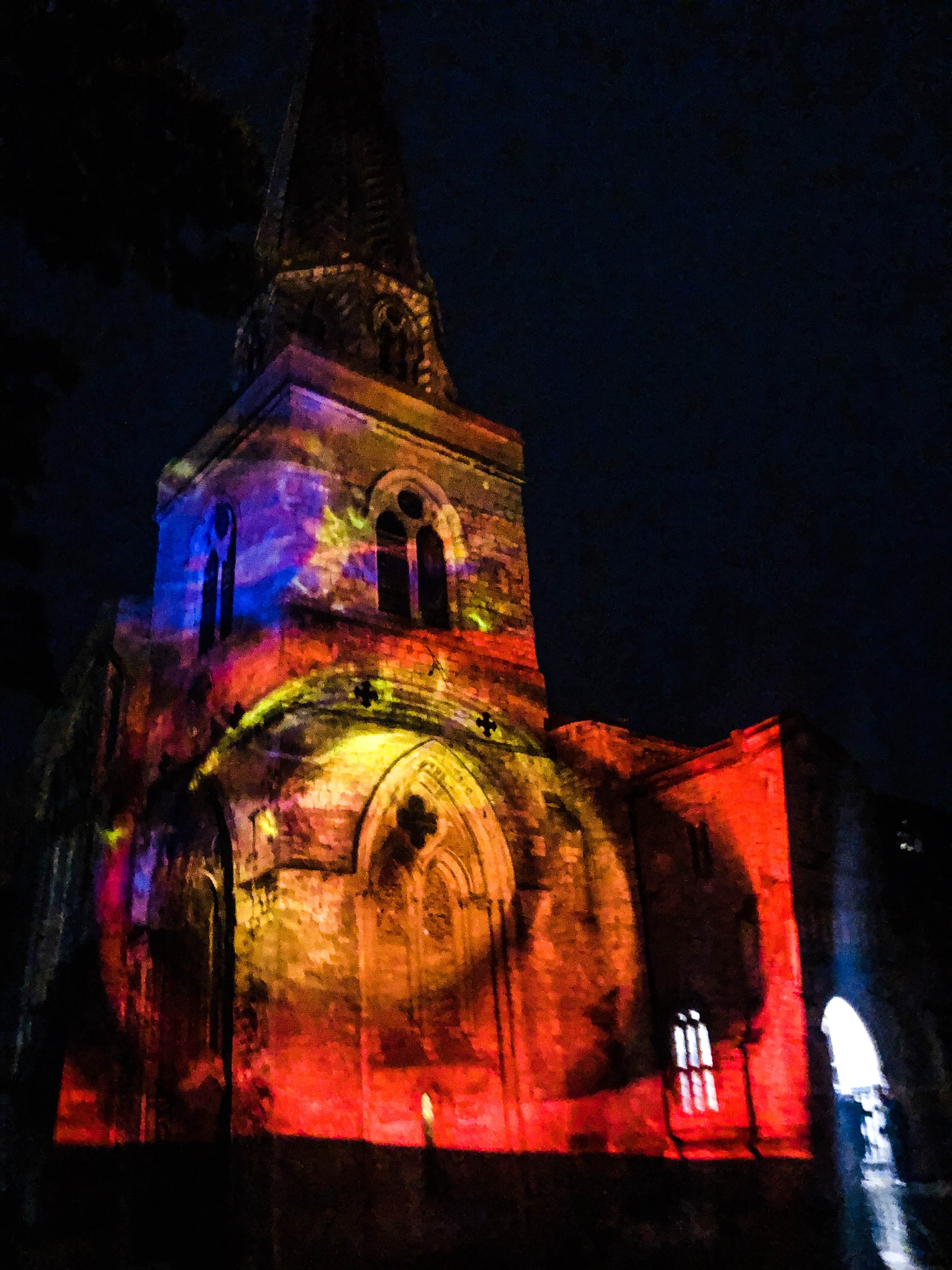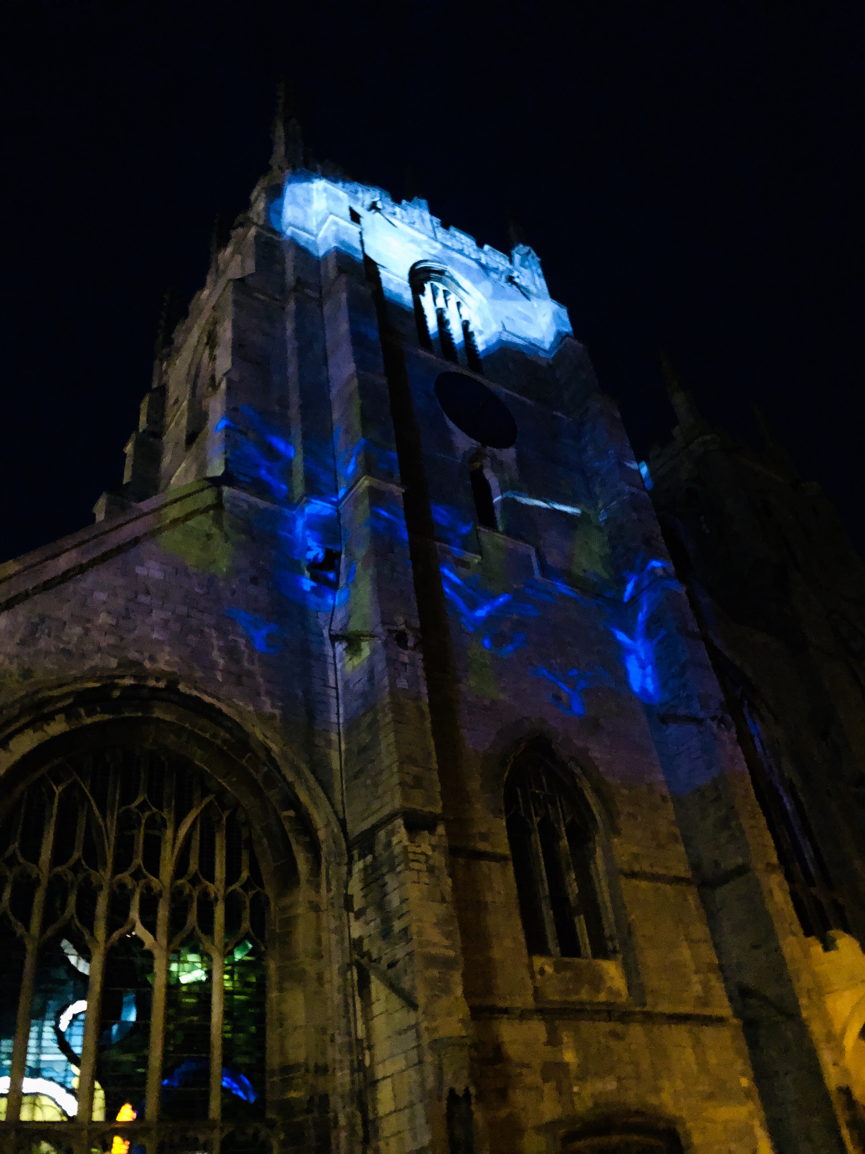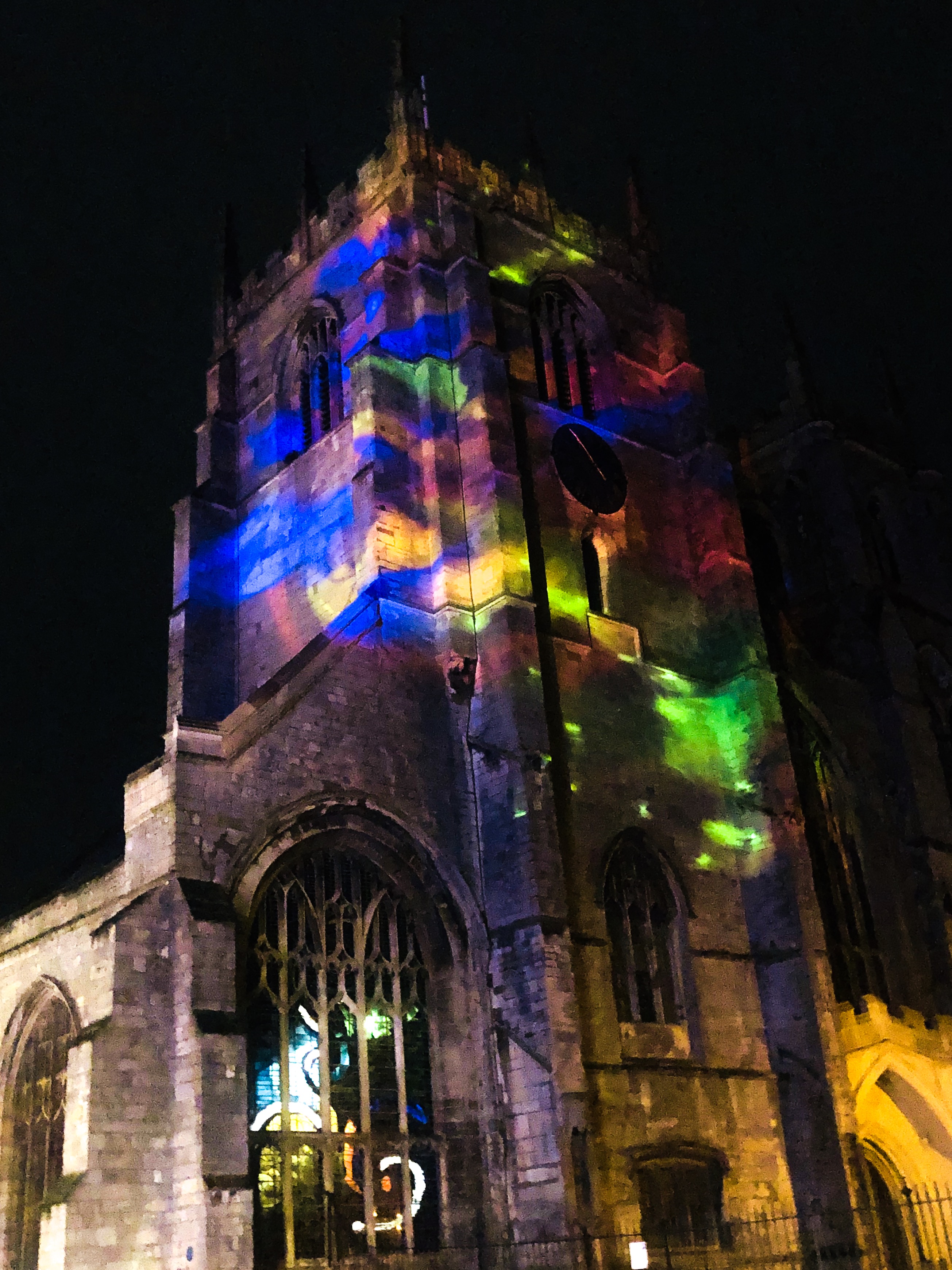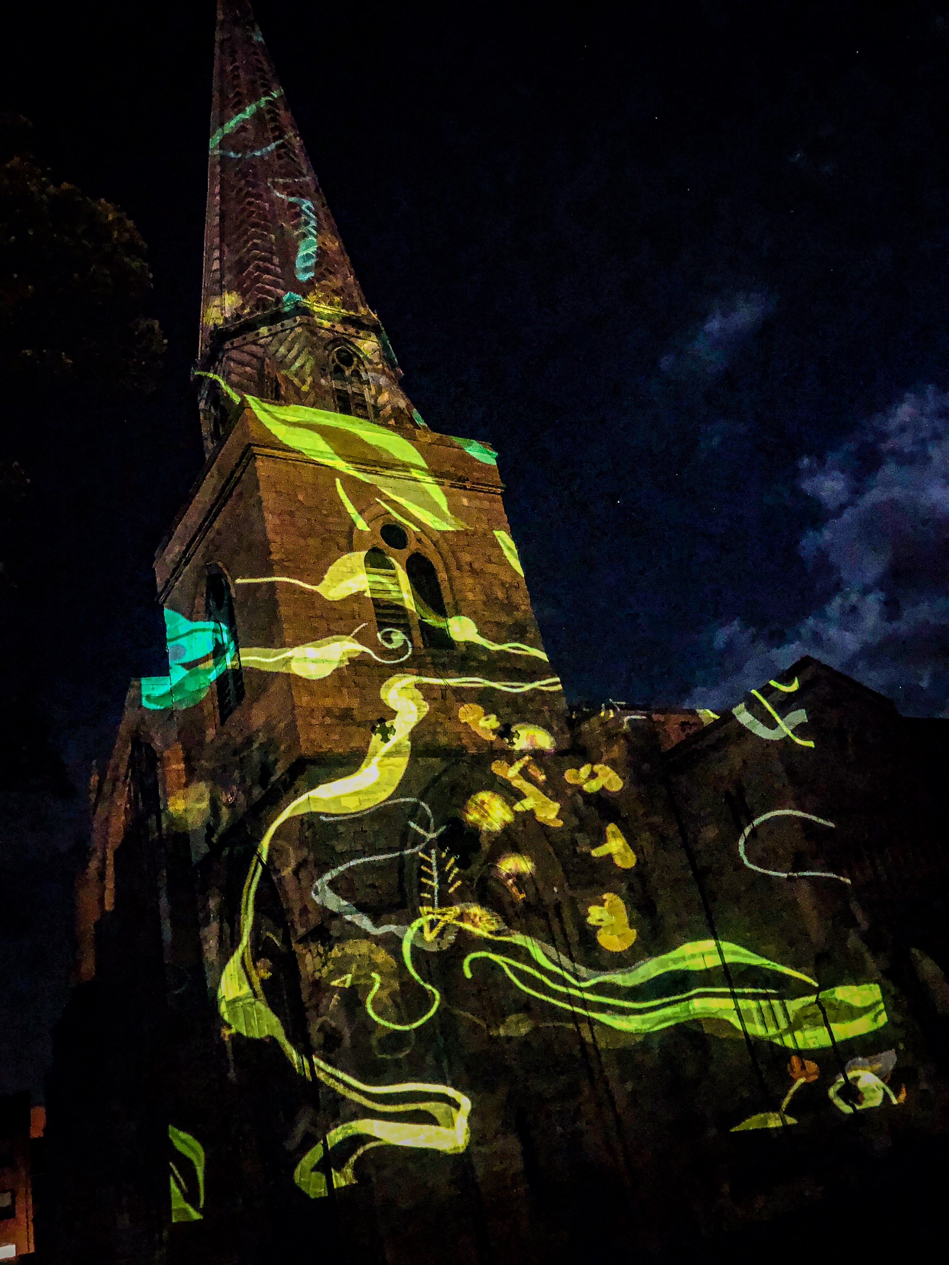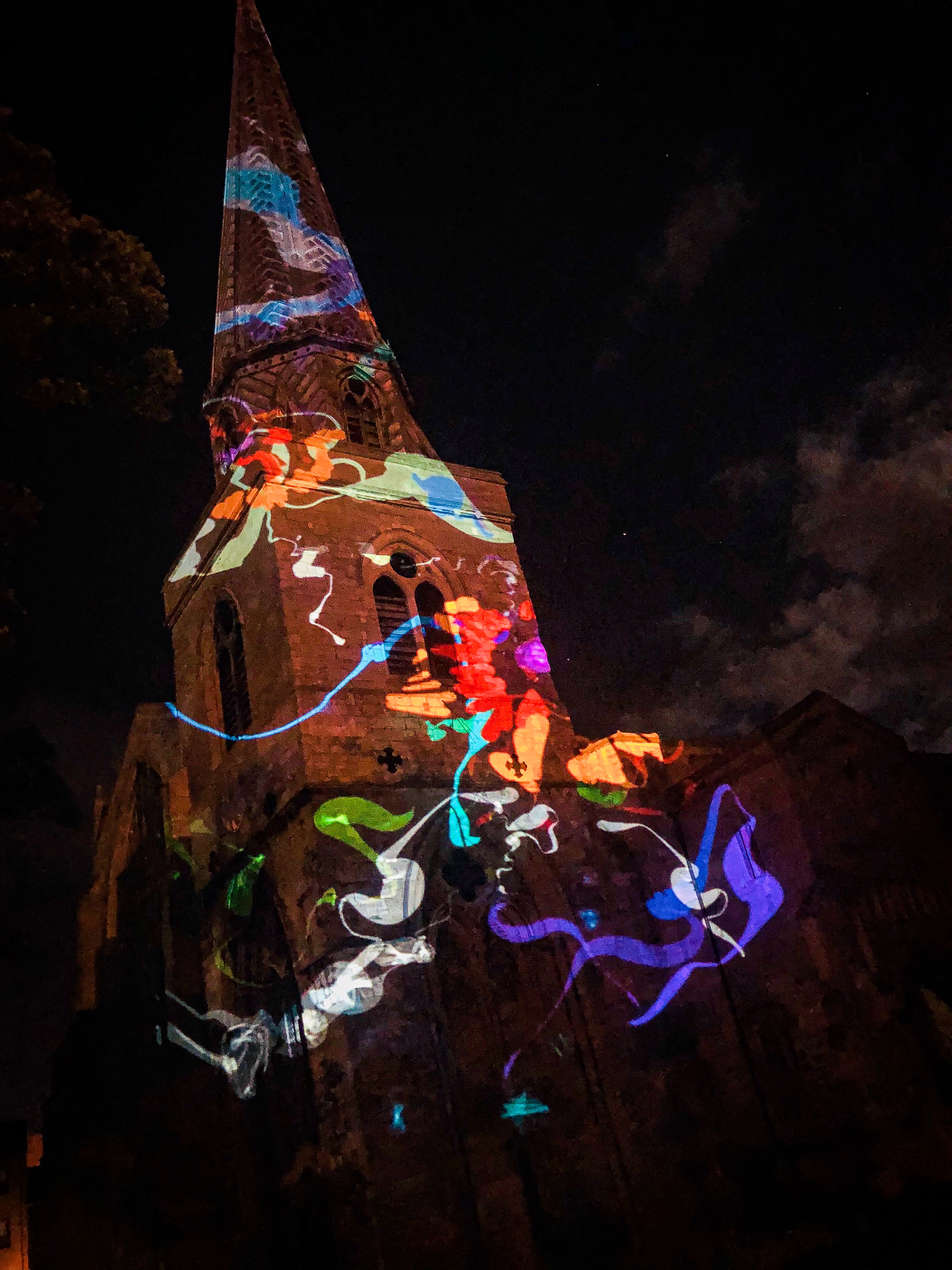 Hi everyone. I just realised I had never shared images from a night festival of light and sound I helped launch in my now-hometown of King’s Lynn. A loop of six designs played simultaneously on two 12th-century churches, St Margaret’s church (aka King’s Lynn Minster, the squared tower) and St Nicholas’s chapel (the pointy spire), which sit half a mile apart. Built 1101 & 1200, respectively, they have a complex history with each other – St N’s was built as the overflow church for St M’s – the latter is the historic heart of the town and was frequented by the rich merchants who lived in this neighbourhood, while St Nick’s belonged more to the maritime community to the north. It was fun to get these buildings in a sort of dialogue with each other as psychedelic autumnal beacons, and to see how the same images and movements played out across their different features.