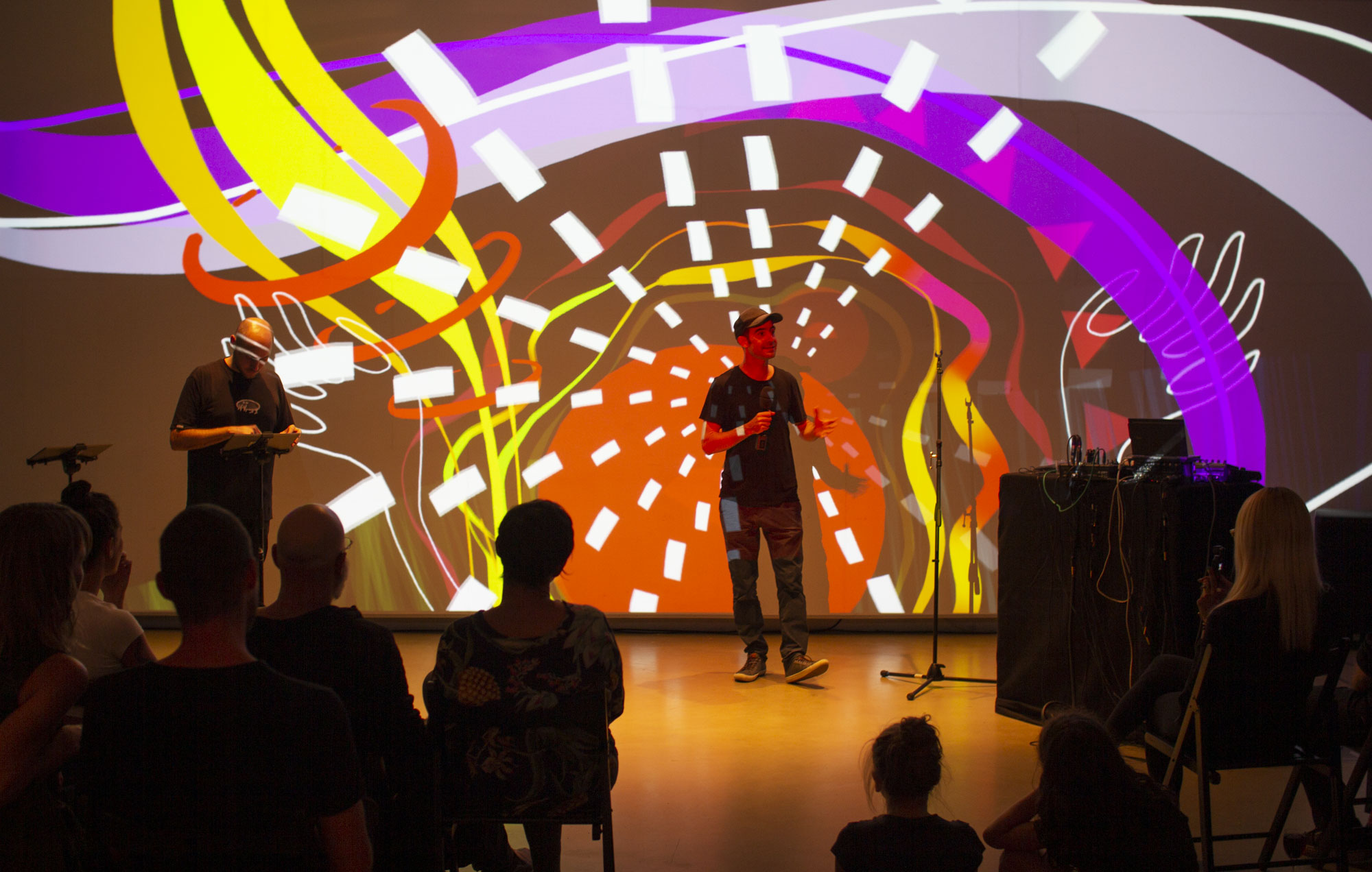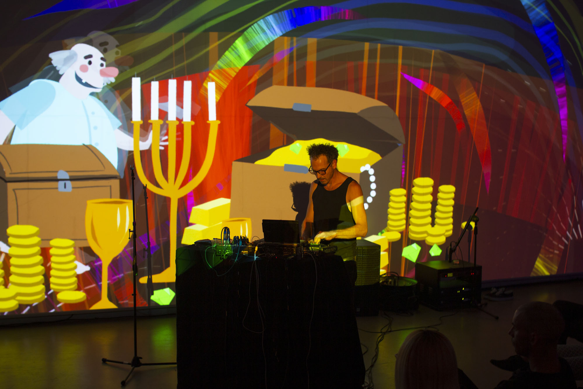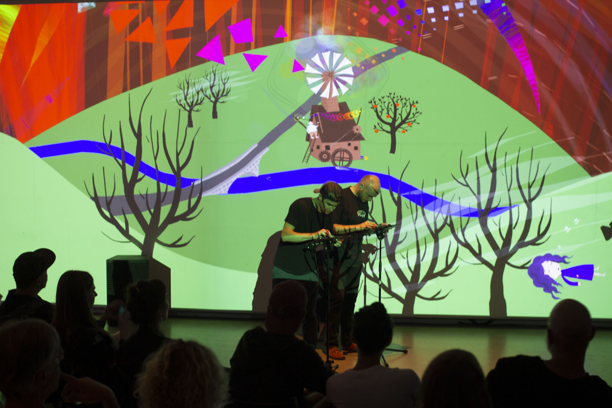 Day one: After workshops during the day with young people, a crowd gathered in the Kunstwerkstatt in the evening and we saw some jaw-dropping performances – my first time seeing Tagtool live in action – in a big room with a screen that wraps around three walls. Some photos below.