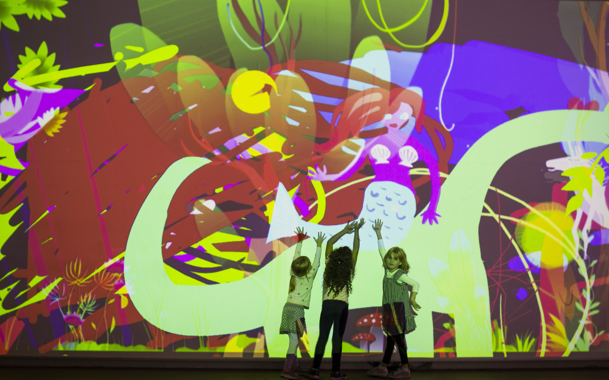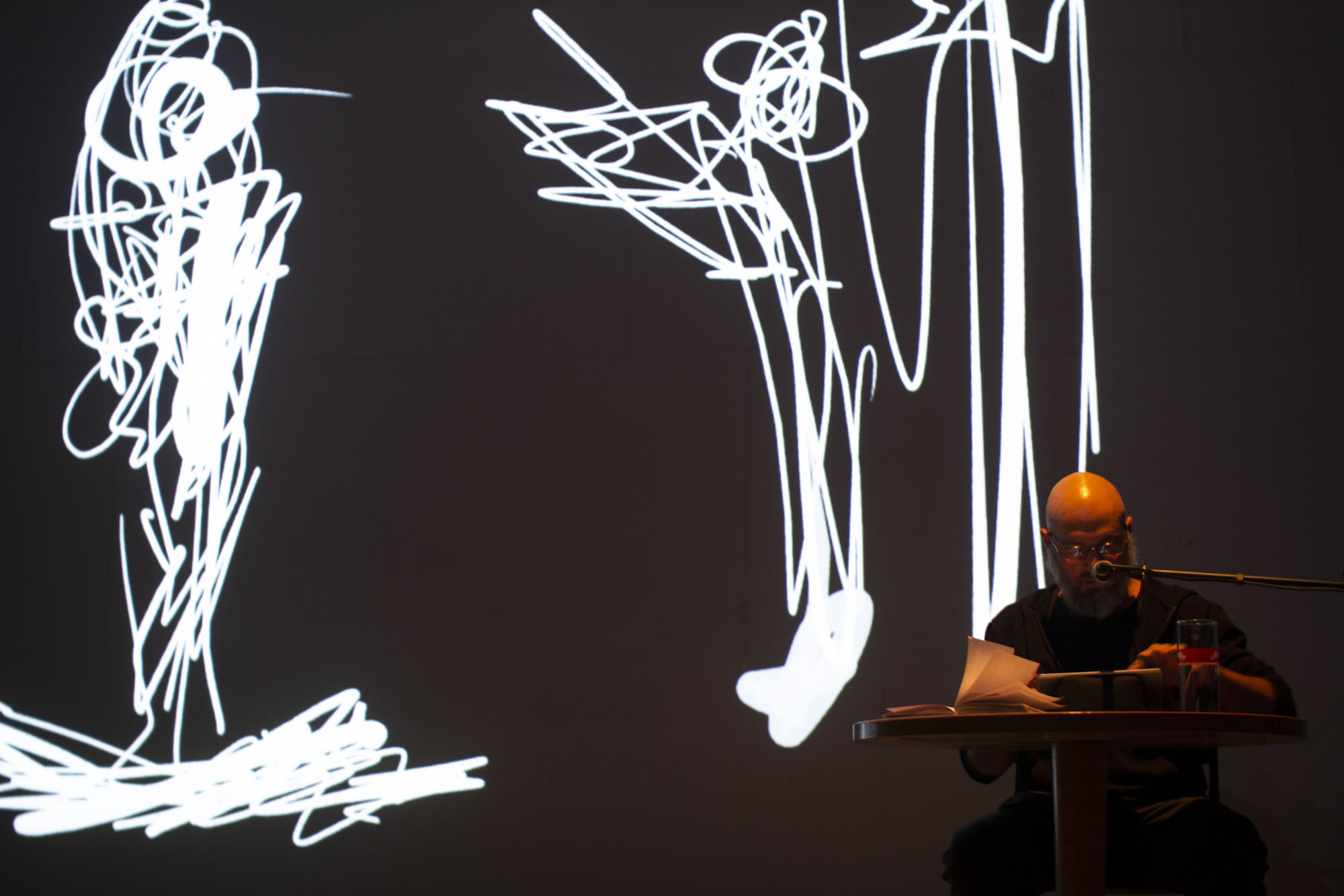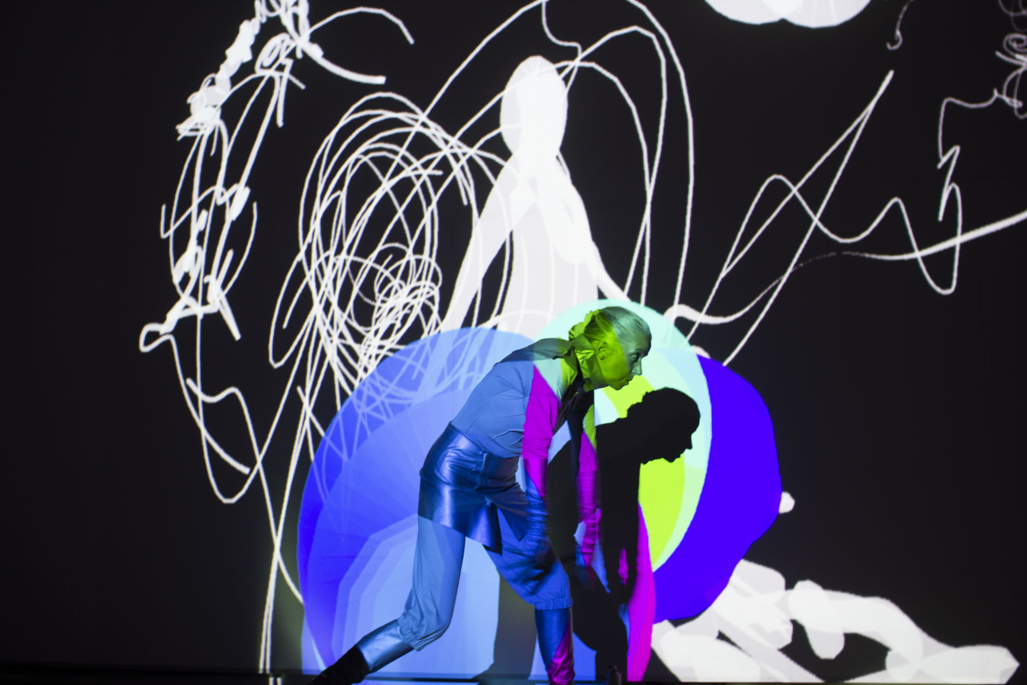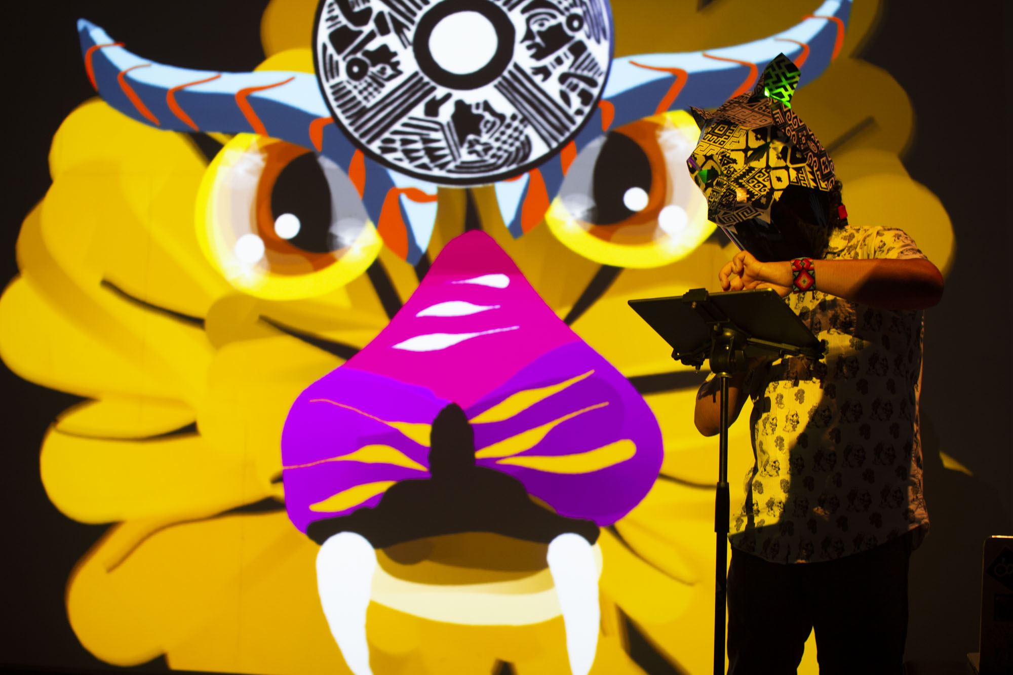Day one: After workshops during the day with young people, a crowd gathered in the Kunstwerkstatt in the evening and we saw some jaw-dropping performances – my first time seeing Tagtool live in action – in a big room with a screen that wraps around three walls. Some photos below.