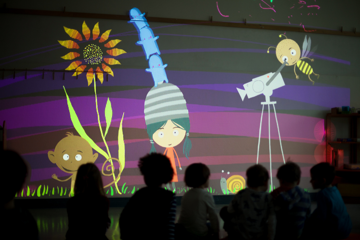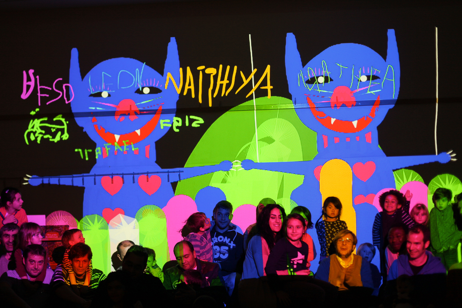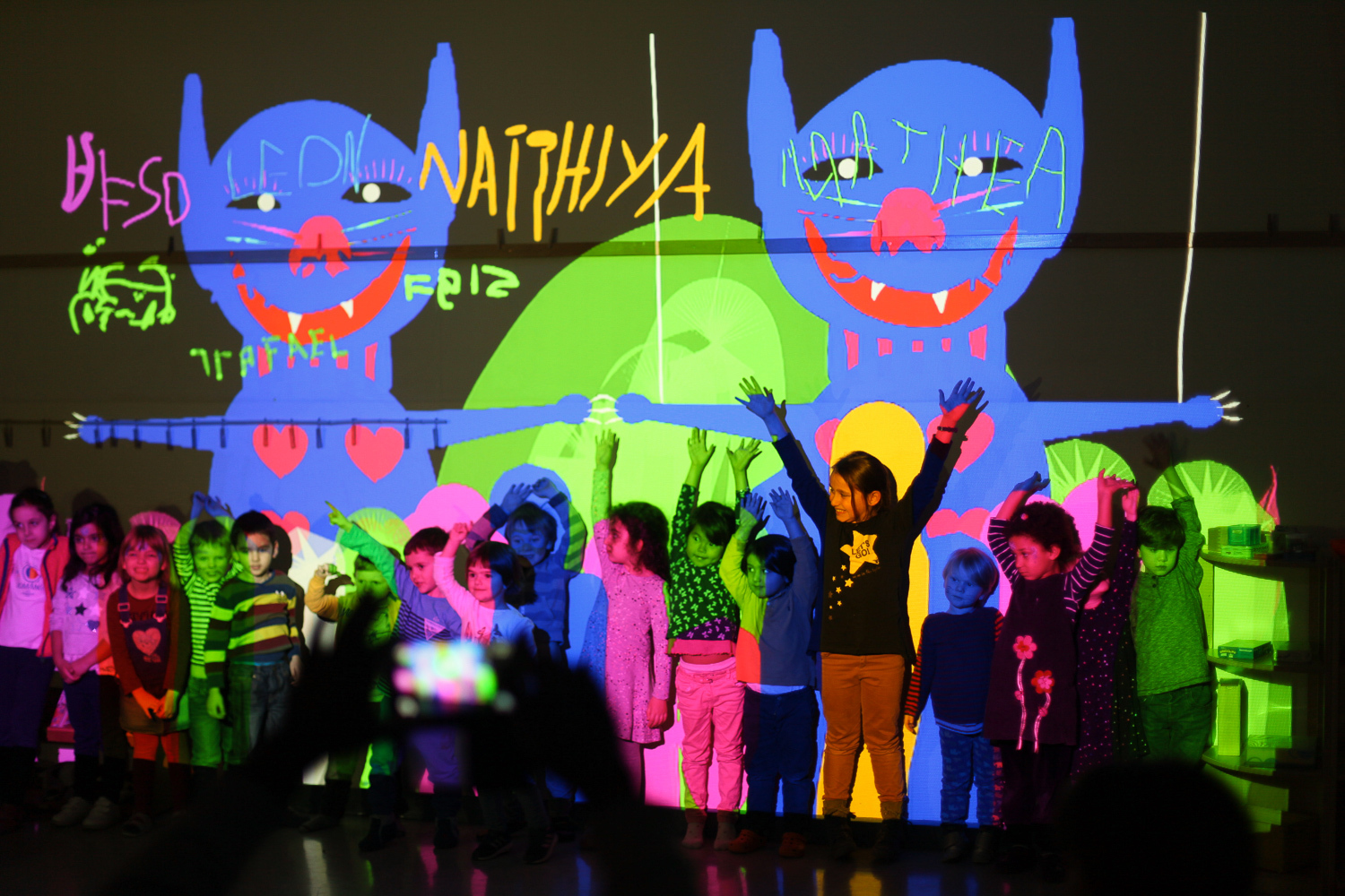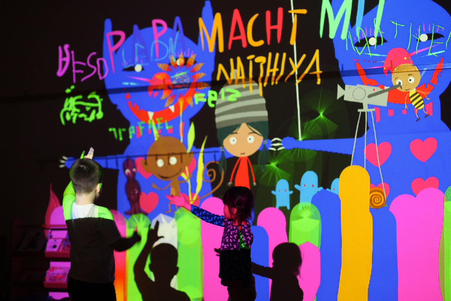 In the end, we reached a compromise by duplicating the cat and having one version with strings and the other without. Reunited, kids and dads alike joined the fun of interacting with the projected animations.