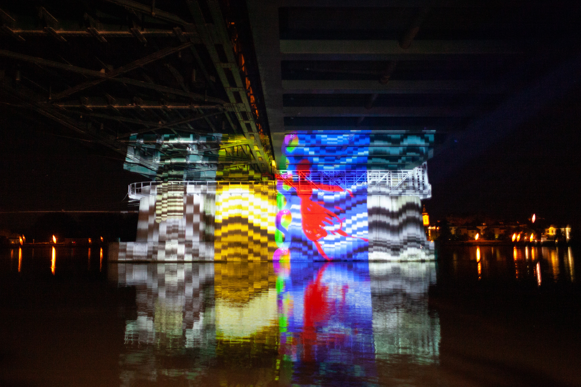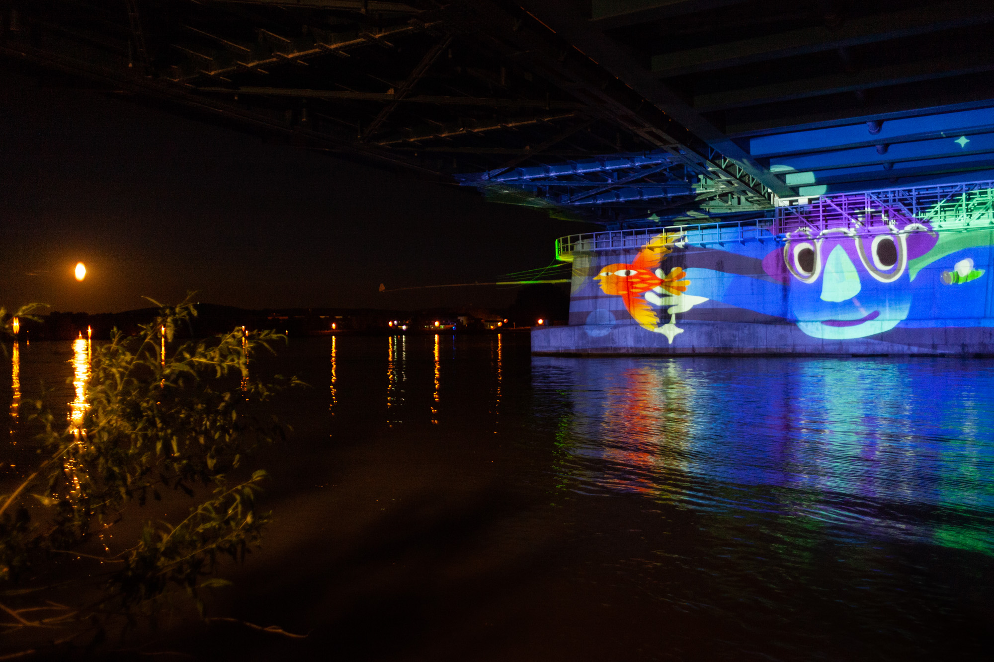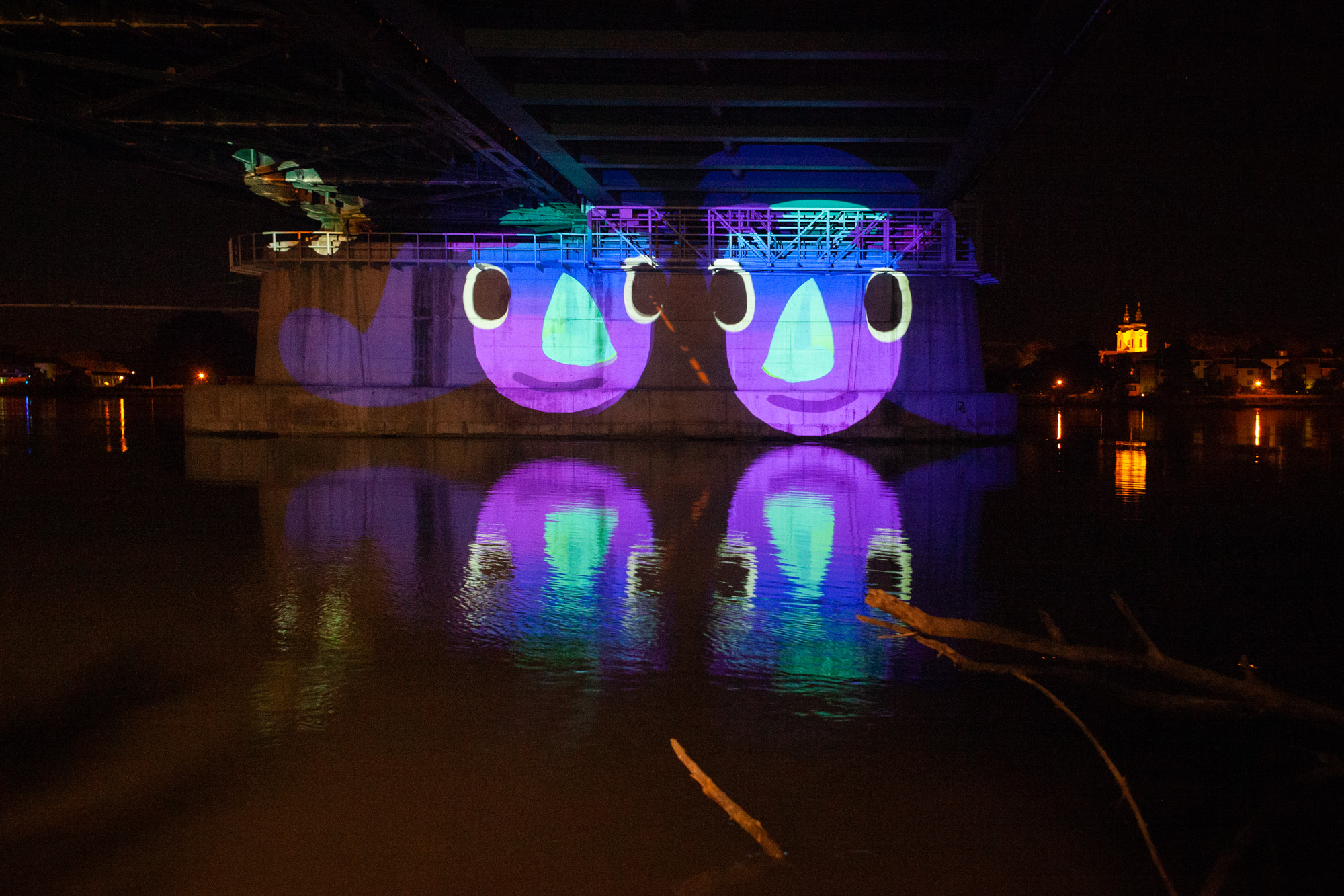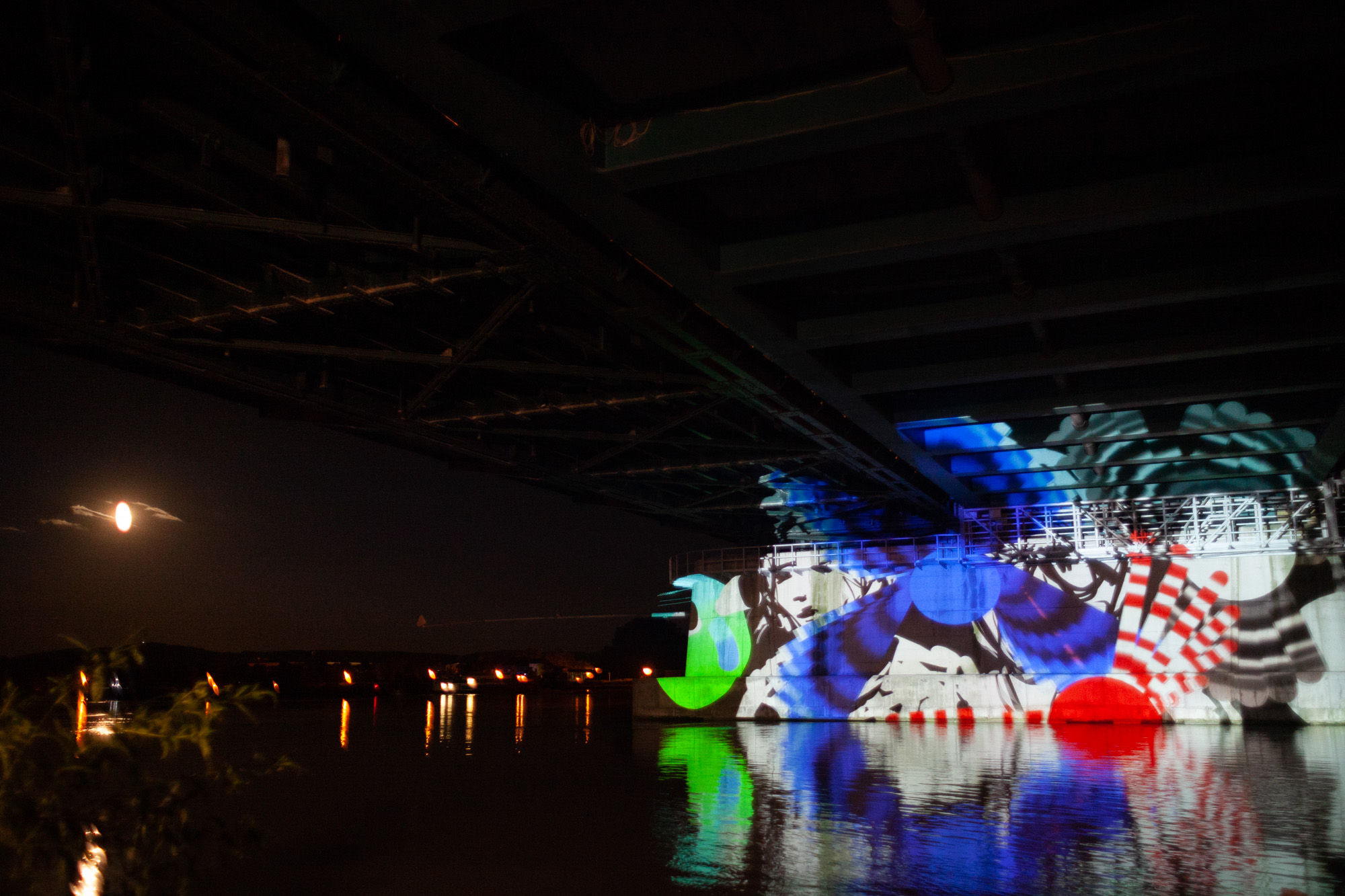 Some images from our first test of the upcoming online multiplayer function of Tagtool! We projected under a bridge at the river Danube. OMAi’s Maki and iink were joined remotely by Frances Sander from Prague, VJSuave from São Paulo, Rimiyoho from Mexico City, and Ilan Katin from Berlin.