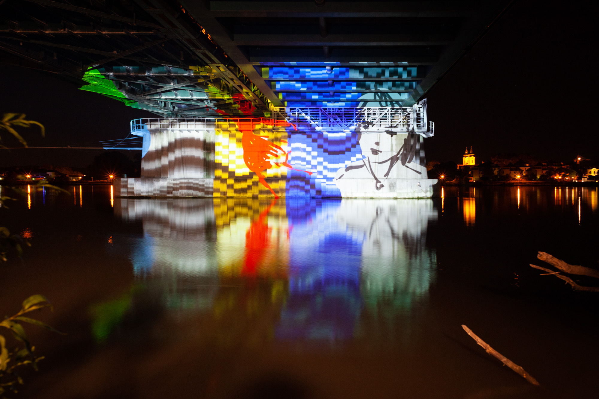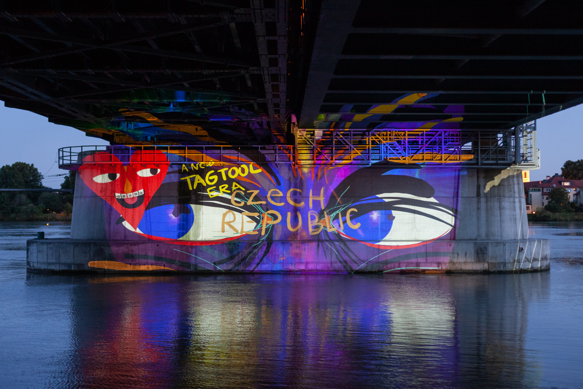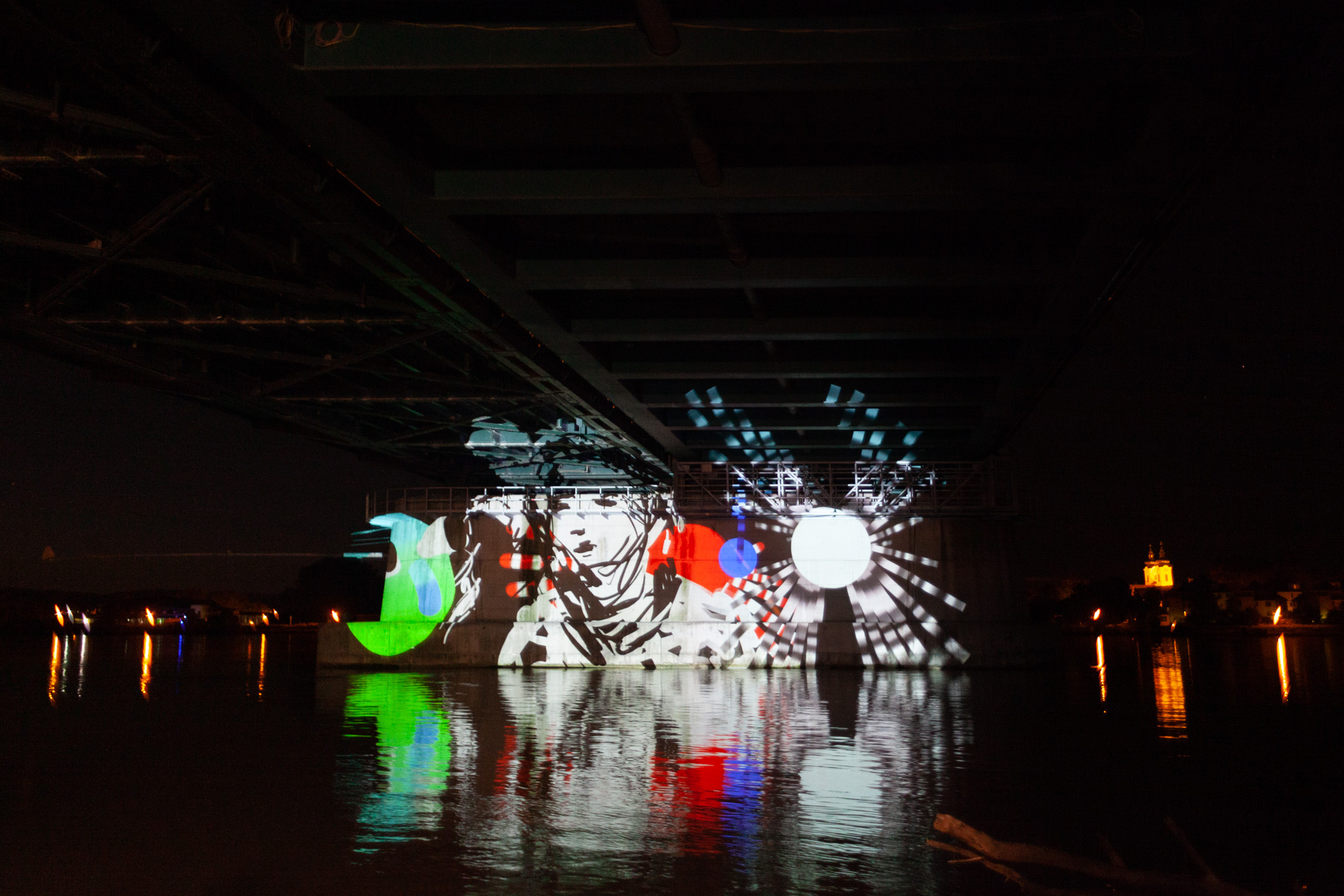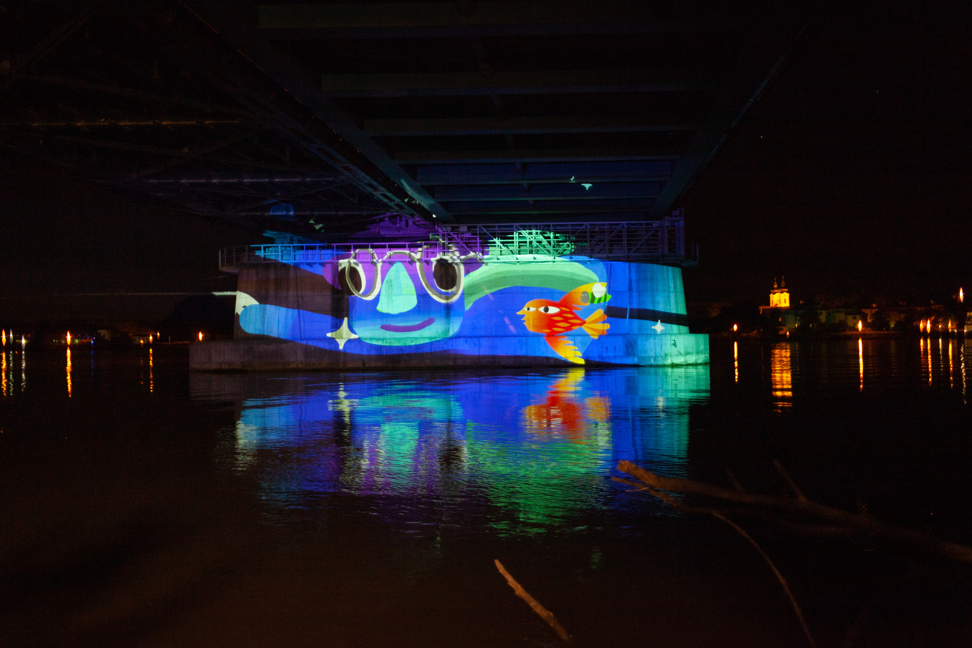 Some images from our first test of the upcoming online multiplayer function of Tagtool! We projected under a bridge at the river Danube. OMAi’s Maki and iink were joined remotely by Frances Sander from Prague, VJSuave from São Paulo, Rimiyoho from Mexico City, and Ilan Katin from Berlin.