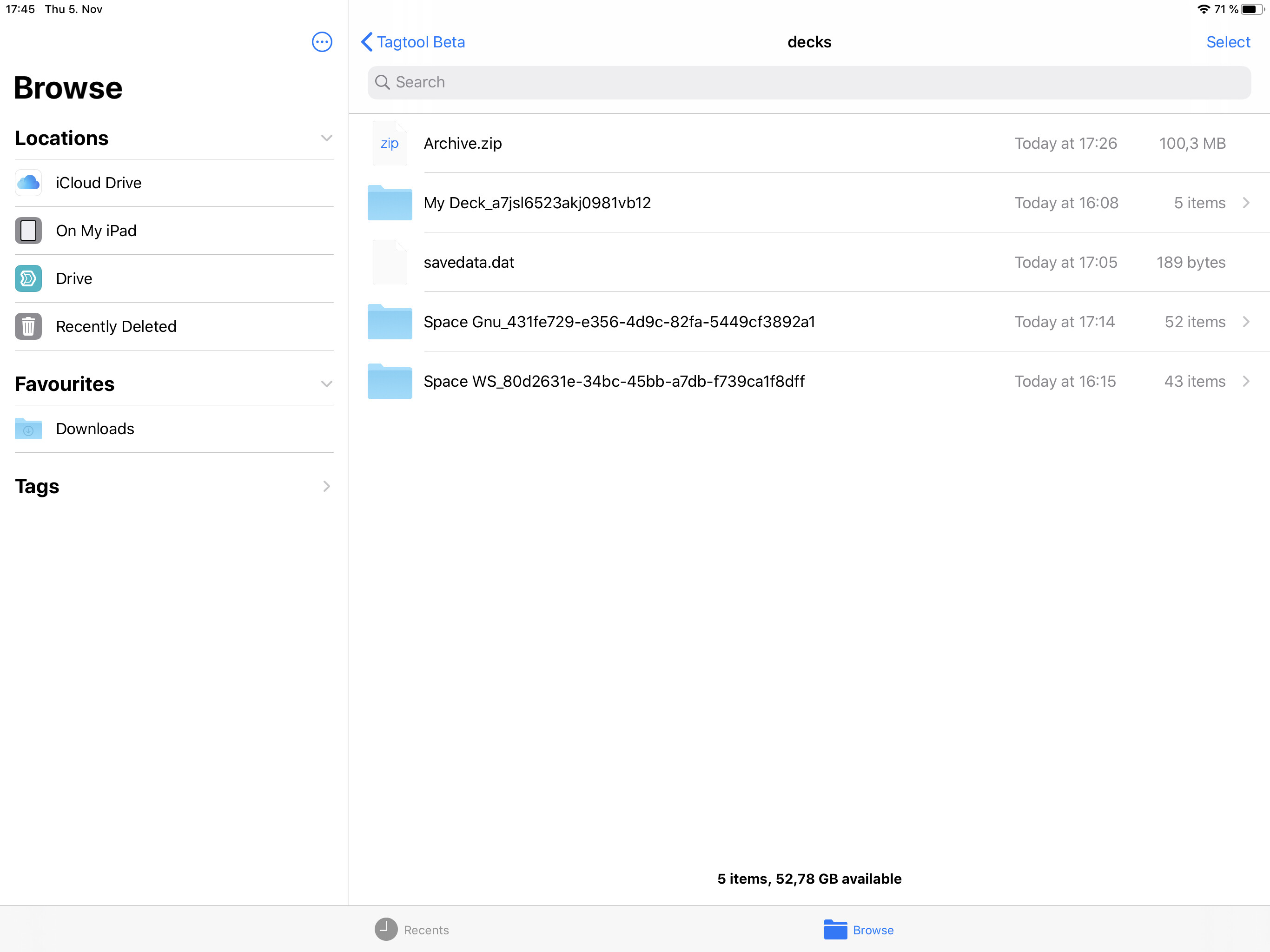 You need to use the files app on your iPad. Go to “Tagtool Beta” → on your ipad and navigate to decks folder.