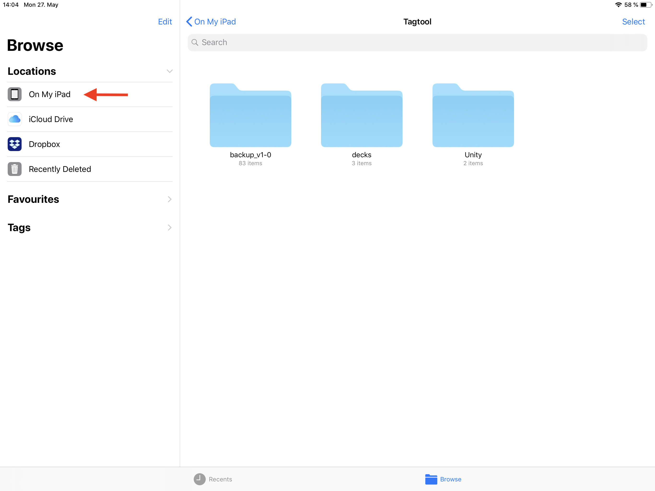 • Decks accessible in Files app - in the iOS Files app, navigate to On My iPad > Tagtool > decks to see all your deck folders. Copy them to a file synching service like iCloud Drive, Dropbox or Google Drive to transfer them to your computer for backup or to share them with other Tagtoolers.